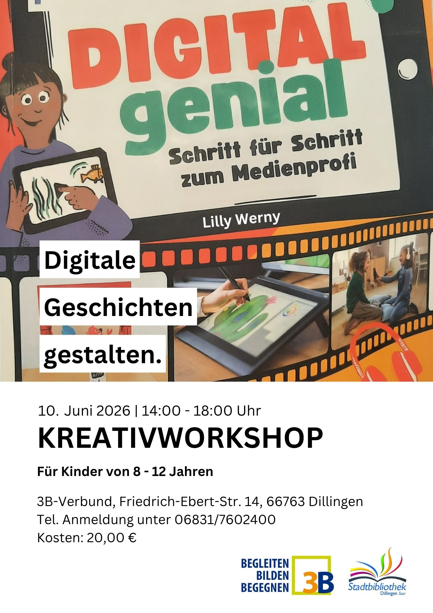 In diesem Workshop tauchen Kinder in die kreative Welt der Medien ein und lernen, eigene kleine Geschichten mithilfe von digitalen Medien zu erzählen. Sie drehen einen Trickfilm, nehmen Geräusche für eine Hörgeschichte auf und zaubern sich für ein Selfie an einen spannenden Ort. Außerdem werden In-App-Käufe und andere wichtige Aspekte rund um Apps thematisiert. Der Workshop basiert auf dem Kreativbuch “Digital Genial!” und wird von der Autorin Lilly Werny durchgeführt. In Kooperation mit dem 3B-Verbund.