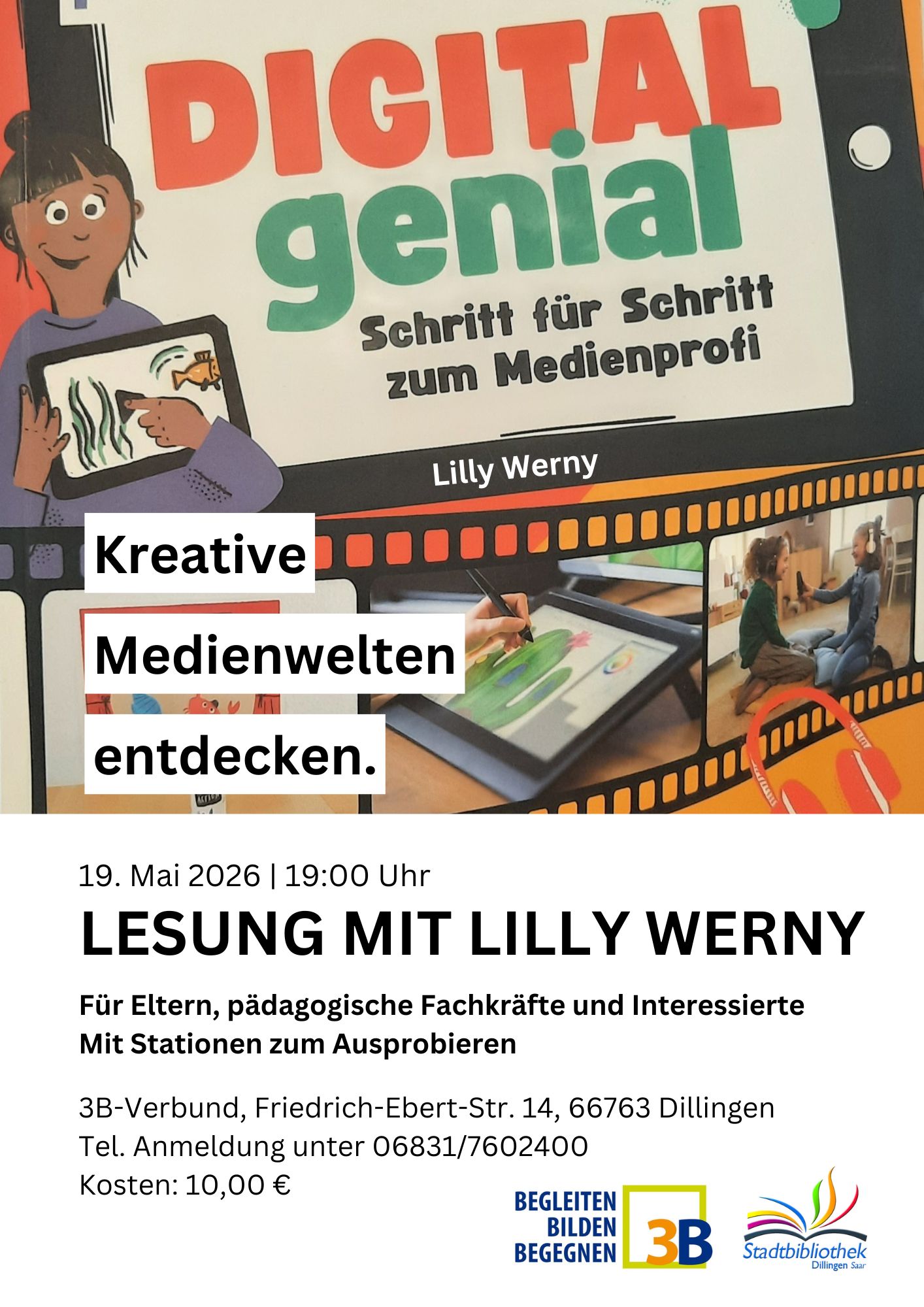 Dabei geht Lilly Werny auch auf einen sicheren Umgang mit Medien ein und zeigt vielfältige Alternativen für die Nutzung von Smartphone und Co. auf. Eine interaktive Lesung für Eltern, pädagogische Fachkräfte und alle Interessierte mit Stationen zum Ausprobieren zu diesen Themen: Trickfilm, erweiterte Realität, Greenscreen und Game zeichnen. In Kooperation mit dem 3B-Verbund.